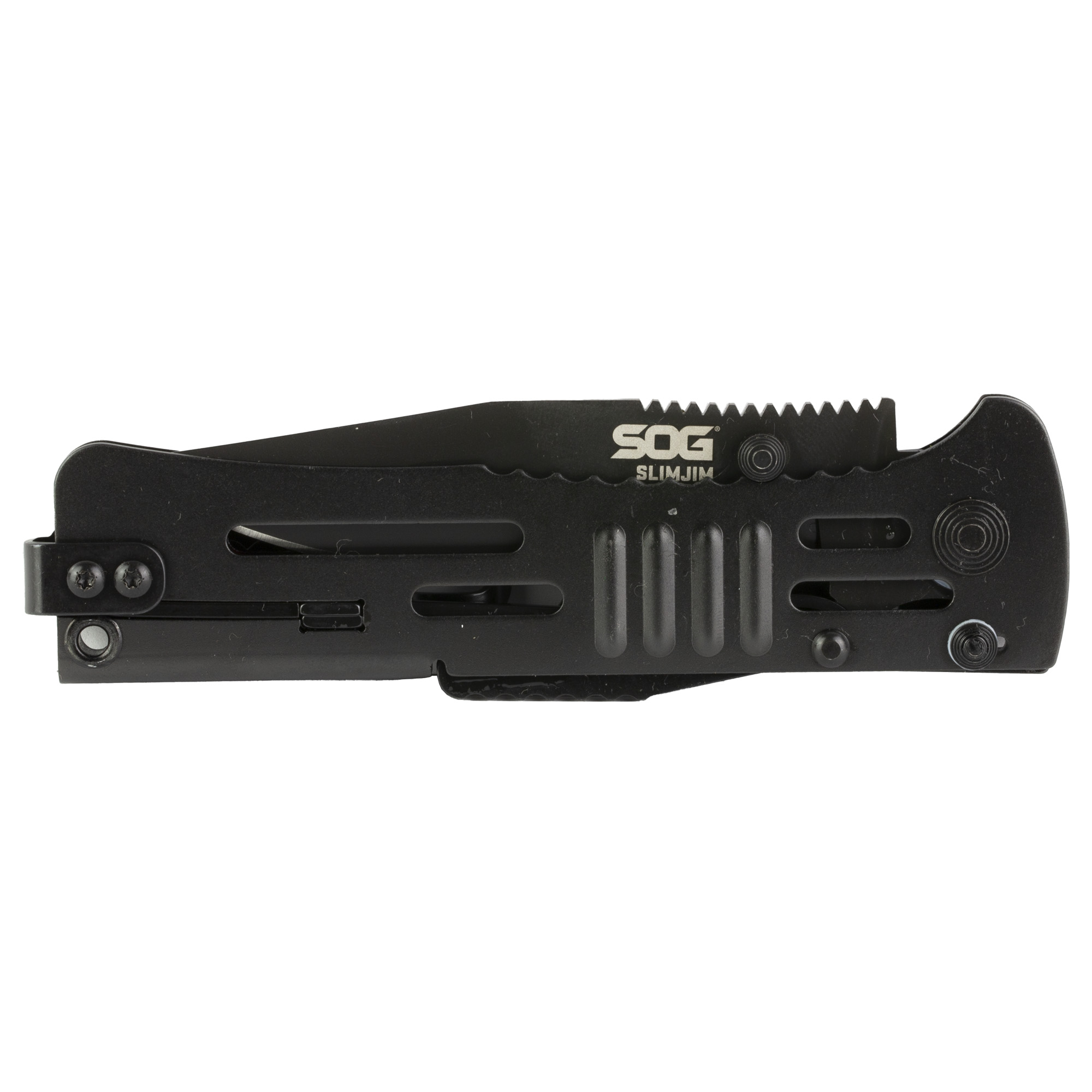 Their technical assisted folding knife line stands out by virtue of simplicity and minimalism. It doesnt try to be the biggest or the loudest in the crowd. It is unobtrusive but always there when you need it. Constructed from a single piece of steel, SlimJim is just that, the slimmest assisted knife in the world. Start to open the blade and let SOG Assisted Technology (S.A.T.) finish the action with a bang, using one of the surest assisted technologies out there. Tactile bumps and cutouts aid in control while all features are purposeful and functional. The patent-pending safety is used to insure the retention of the blade in the handle as well as acts as a double lock in the open position. The stealth carry clip is reversible.